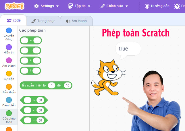 pick random) để tạo ra các sự kiện ngẫu nhiên trong trò chơi, chẳng hạn: pick random (1) to (6) để chọn một số ngẫu nhiên từ 1 đến 6 cho các quyết định trong game.Phép toán trong Scratch là công cụ rất hữu ích để xử lý các giá trị, điều kiện và sự kiện trong các chương trình của bạn, giúp bạn tạo ra các trò chơi và ứng dụng thú vị và tương tác.